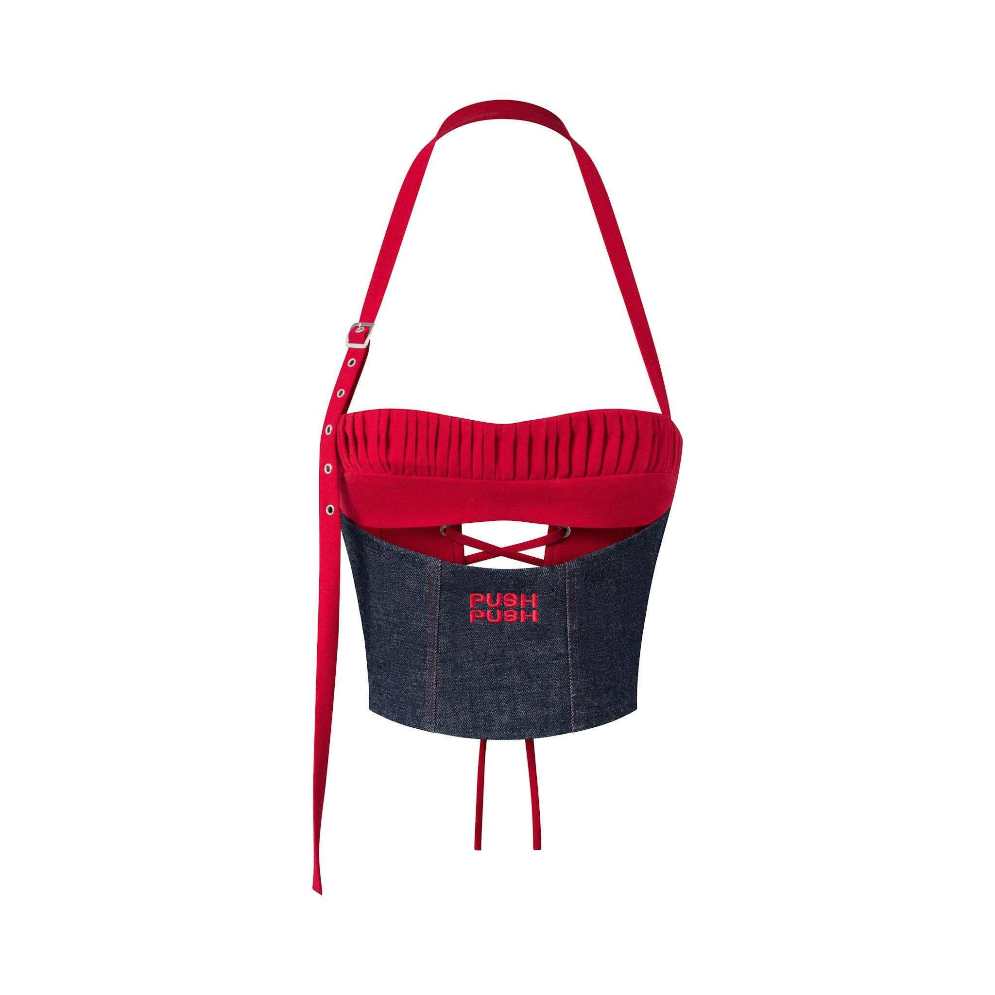 Structured halter top combining red Kate fabric and navy selvedge denim (15oz). The pleated bandeau bust is subtly embroidered with a tonal "Push Push" logo. Crafted with a double-layered construction, the inner lining is also made of red Kate fabric for a smooth, luxurious feel – not your typical inner lining. Designed with a pointed corset waist, back lace-up detailing, and a side zipper for ease. Fitted silhouette with premium finishing throughout.