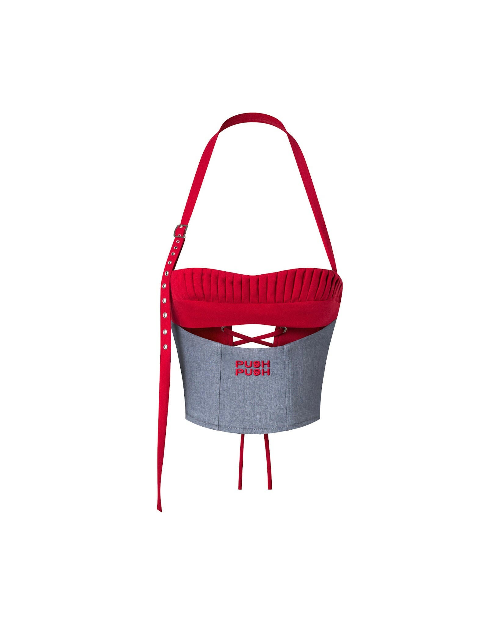 Corset crop top made from a combination of red and grey Kate fabric. The bust area features delicate pleats and an embroidered "Push Push" logo in matching red, adding a refined touch. The top is double-layered — the inner lining also uses Kate fabric instead of typical lining material, ensuring a structured form while offering comfort. The back is detailed with lace-up design, and a convenient side zipper completes the look.