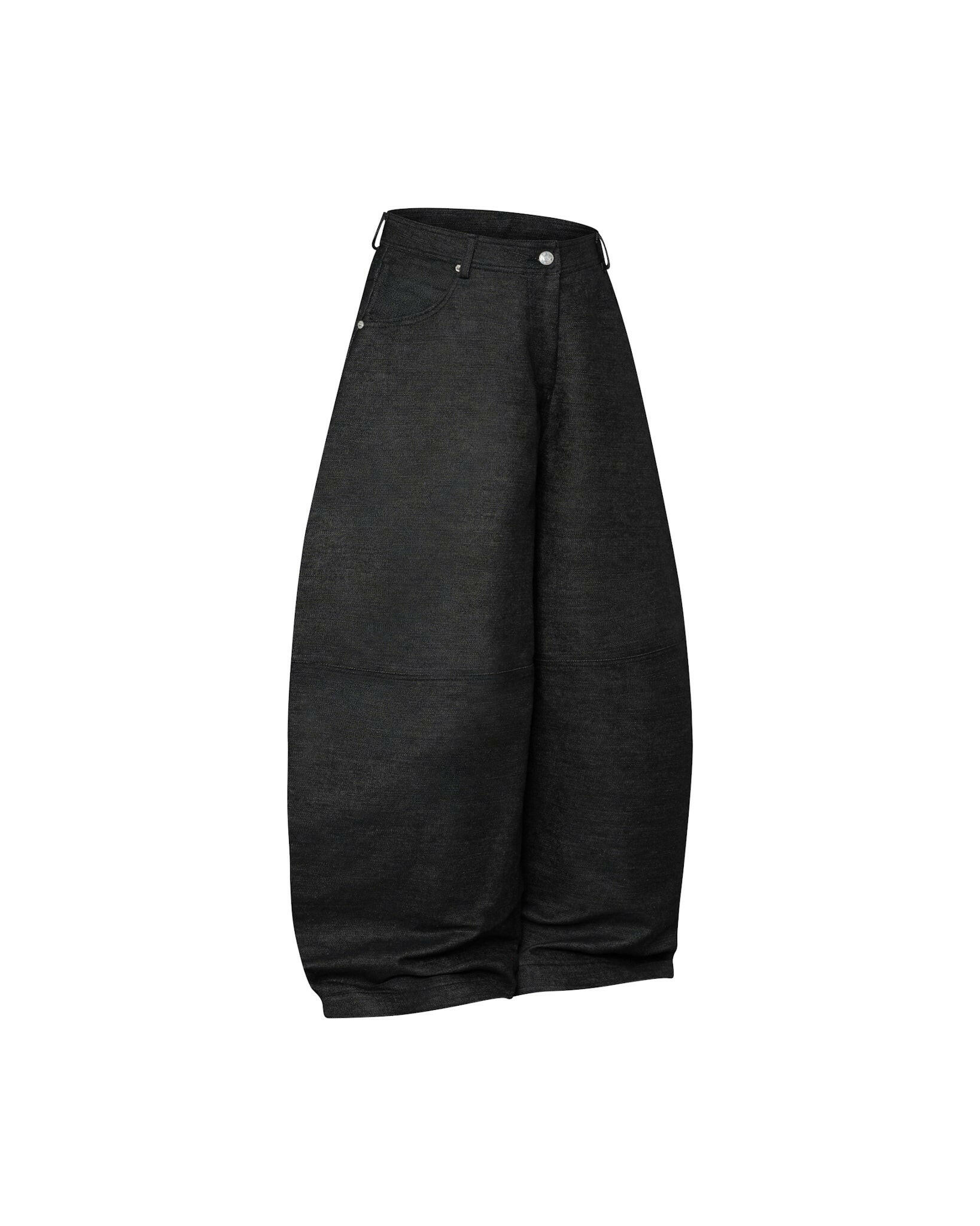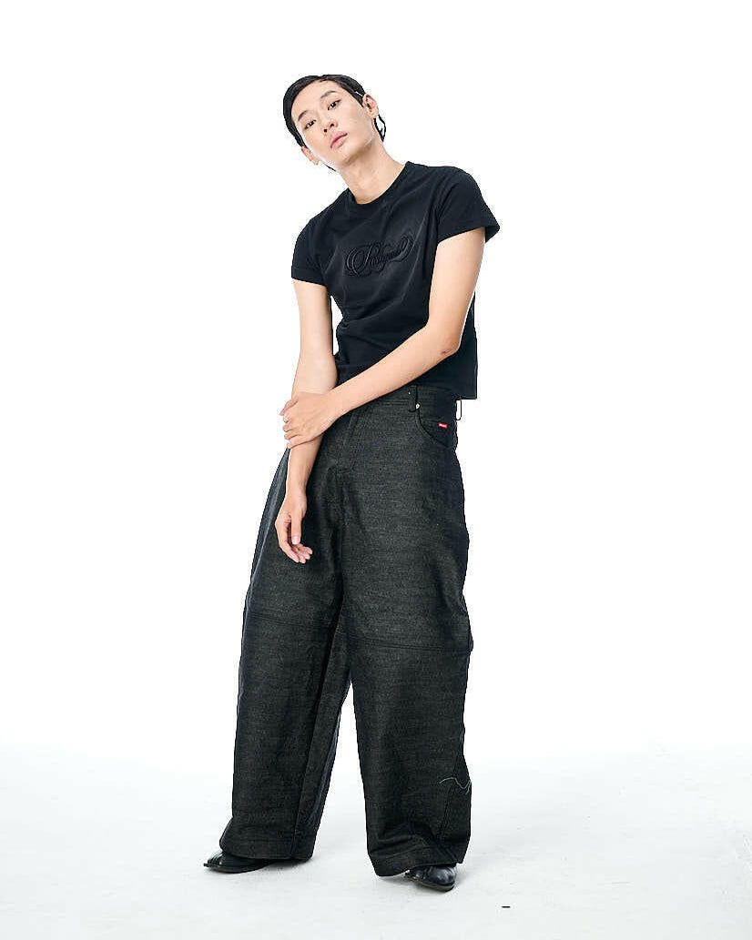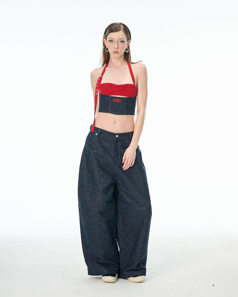 Cut from heavyweight raw selvedge denim — 14oz in black and 15oz in navy — these jeans feature an exaggerated baggy silhouette with wide-leg volume. Finished with a red leather brand patch at the back and a small red woven tab at the front. The metal button is engraved with the Push Push logo. Rolled cuffs reveal selvedge edges, emphasizing craftsmanship and structure.